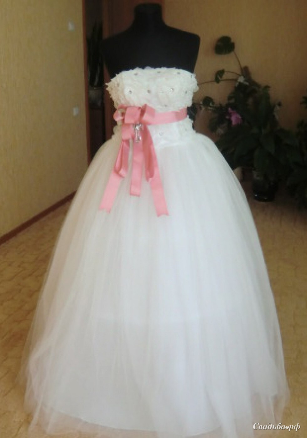 Очень пышное платье цвета эйвори. Декорировано розовой лентой.